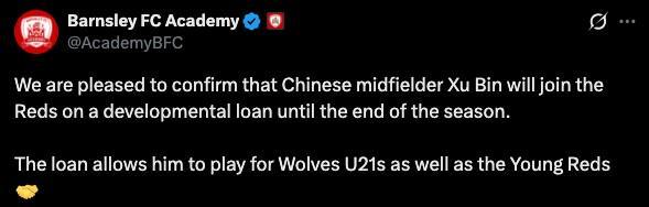 巴恩斯利青训学院的官方公告是:“我们很高兴地确认,中国中场球员徐彬将作为发展性租借球员加盟巴恩斯利,租借期将持续至本赛季结束。这笔租借将允许他同时代表狼队U21及巴恩斯利青年队出战。